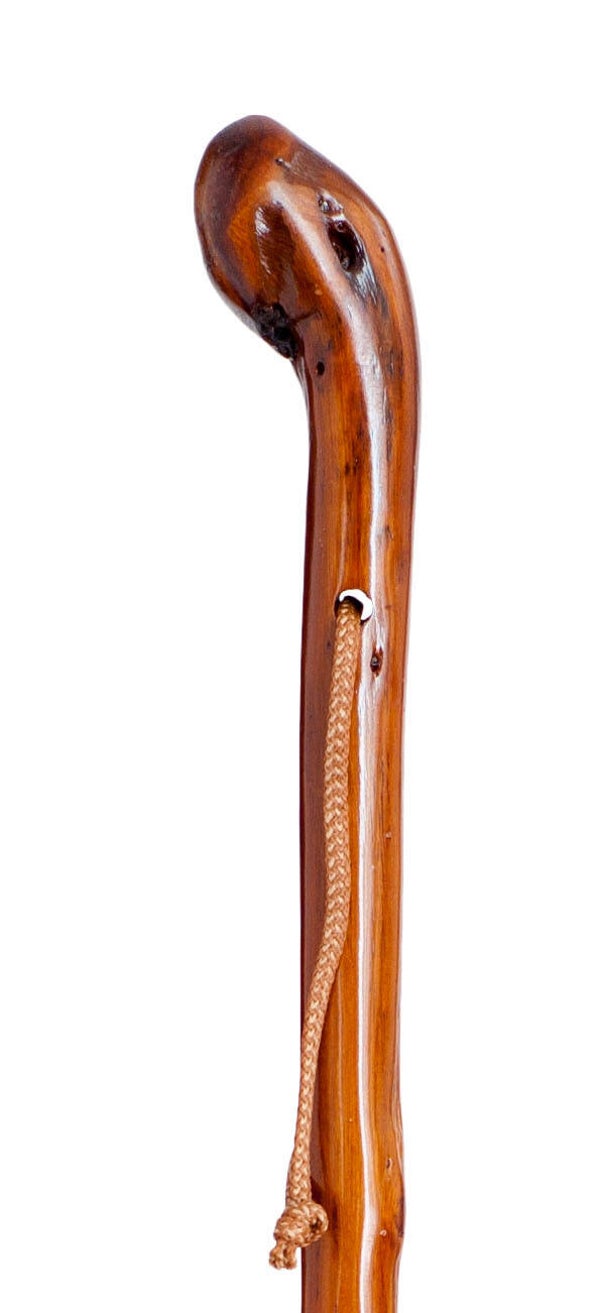 Hiking/wandelstok van gelakt kastanjehout, voorzien van een handlus en een stalen punt.