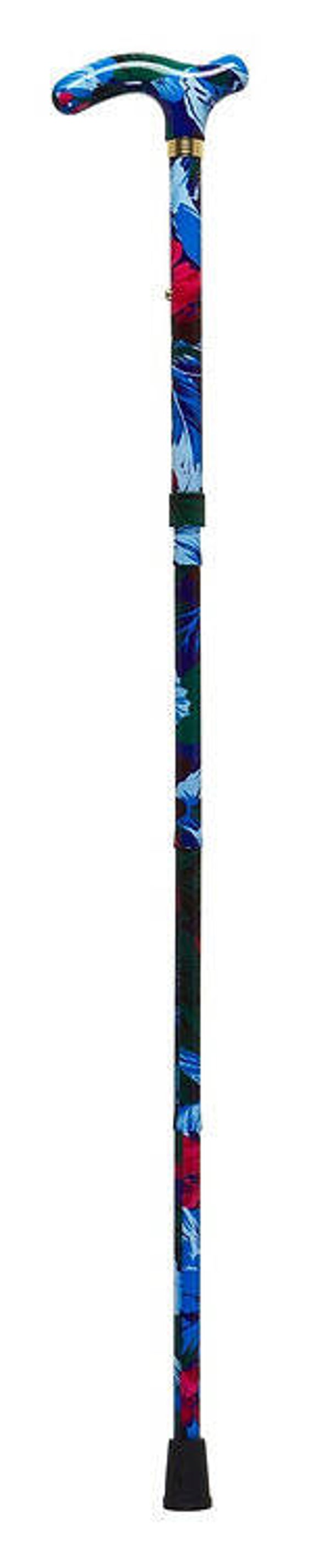 Opvouwbare en instelbare dames wandelstok in een meerkleurig bloemen motief in 4 secties verdeeld, doorlopend op de Derby handgreep. Deze wandelstok is voorzien van een bronskleurige ring en een rubberen dop. Inclusief opbergclip.